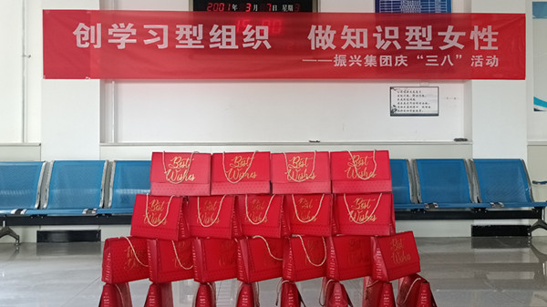 在慶祝三八婦女節(jié)儀式上,集團(tuán)公司副董事長鄭龍和副總經(jīng)理蘭小偉為全體女職工發(fā)放了福利并合影。